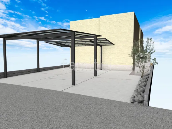 カーポートと土間コンクリートで使いやすい車庫の新築シンプル オープン外構